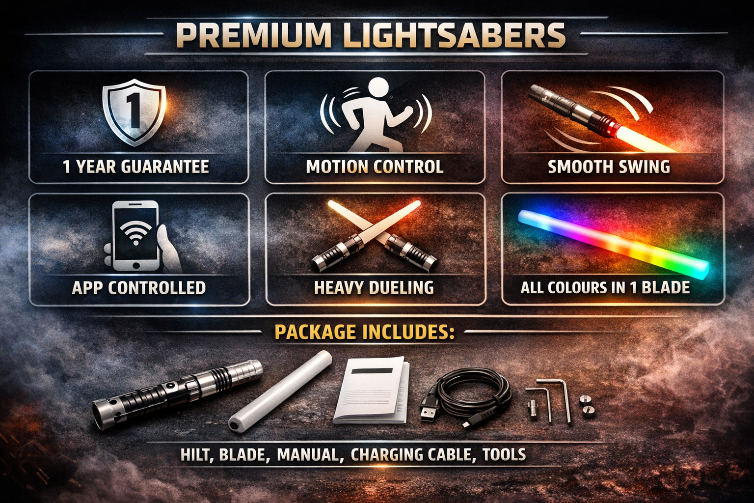 Package includes 1 hilt 1 blade 92cm connector charging cable manual set with allen & screws